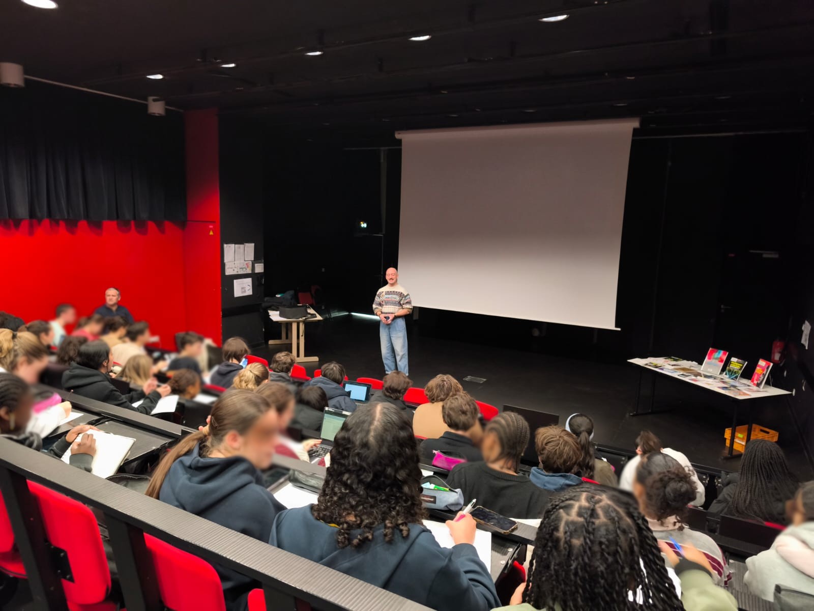 De nombreuses questions évoquées par Thibault Prévost (journaliste spécialisée dans la Tech et intervenant pour le média indépendant "Arrêt sur Images") lors de cette conférence passionnante où les échanges riches et variés montrent que pour les élèves de St-Ex, CEP 1ère et Terminale ainsi que Classe de Russe et d’Arts Plastiques, le progrès tant vanté ne laisse pas de soulever des problématiques bien identifiées