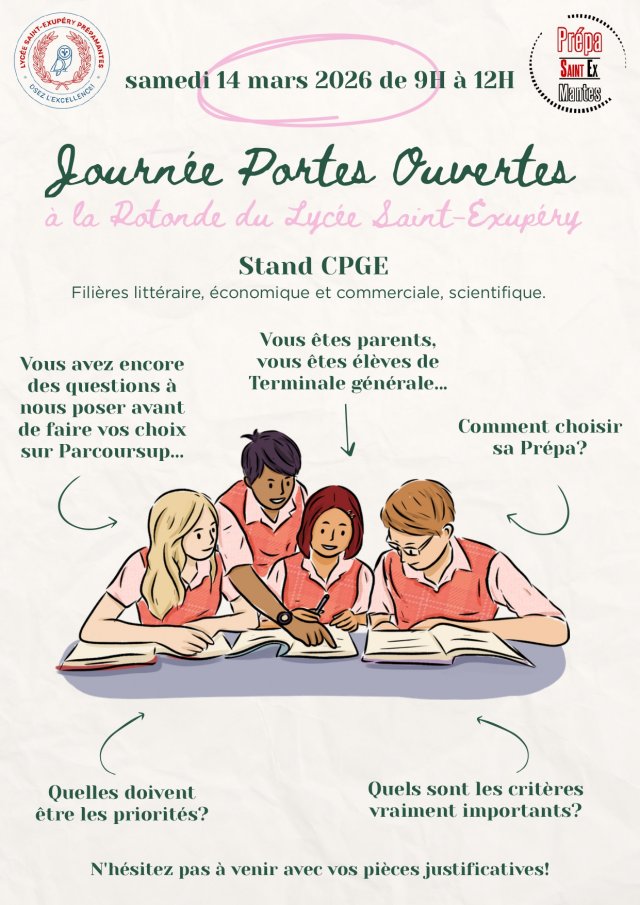 Lors des journées portes ouvertes du Lycée Saint-Exupéry, venez découvrir nos classes préparatoires aux Grandes Ecoles (CPGE) et leurs filières Littéraire, Économique et Commerciale, Scientifique.